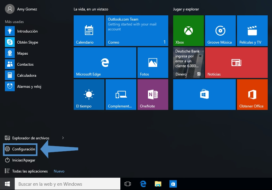 En este artículo te mostramos cómo instalar el controlador genérico de la impresora y como establecerla como impresora predeterminada en Windows para que no tengas problemas con ENCOM a la hora de imprimir tus tickets. El primer paso que debes realizar es dar clic en la ventana de " Inicio ➜ Configuración".