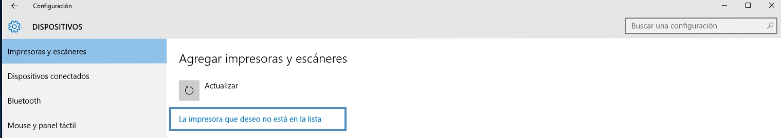 Windows buscará impresoras nuevas, mientras tanto, nota que apareció una opción que dice "La impresora que deseo no está en la lista" da clic en esta opción.