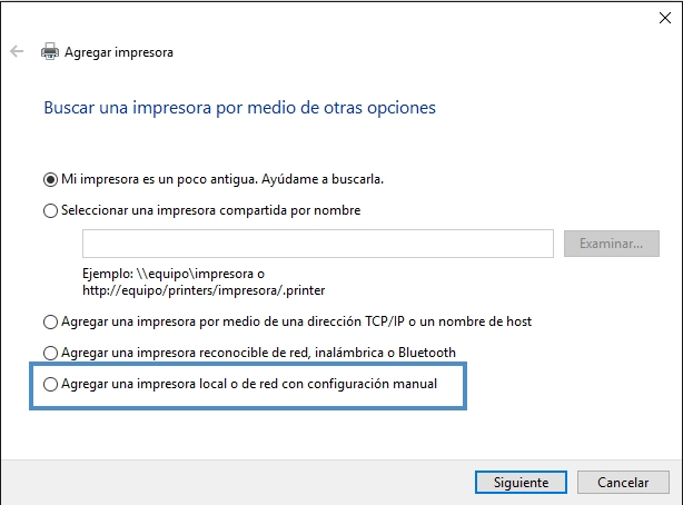 En esta pantalla selecciona la ultima opción que dice: "Agregar una impresora local o de red con configuración manual".