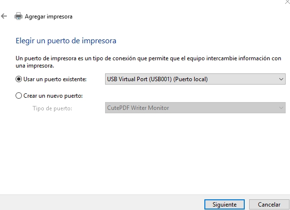 En esta pantalla selecciona la opción " Usar un puerto existente" y da clic en la flecha hacia abajo para que te muestre los puertos, deberás seleccionar "USB Virtual Port 001" o bien, cualquier opción de "USB" Que te aparezca disponible. Da clic en "Siguiente".